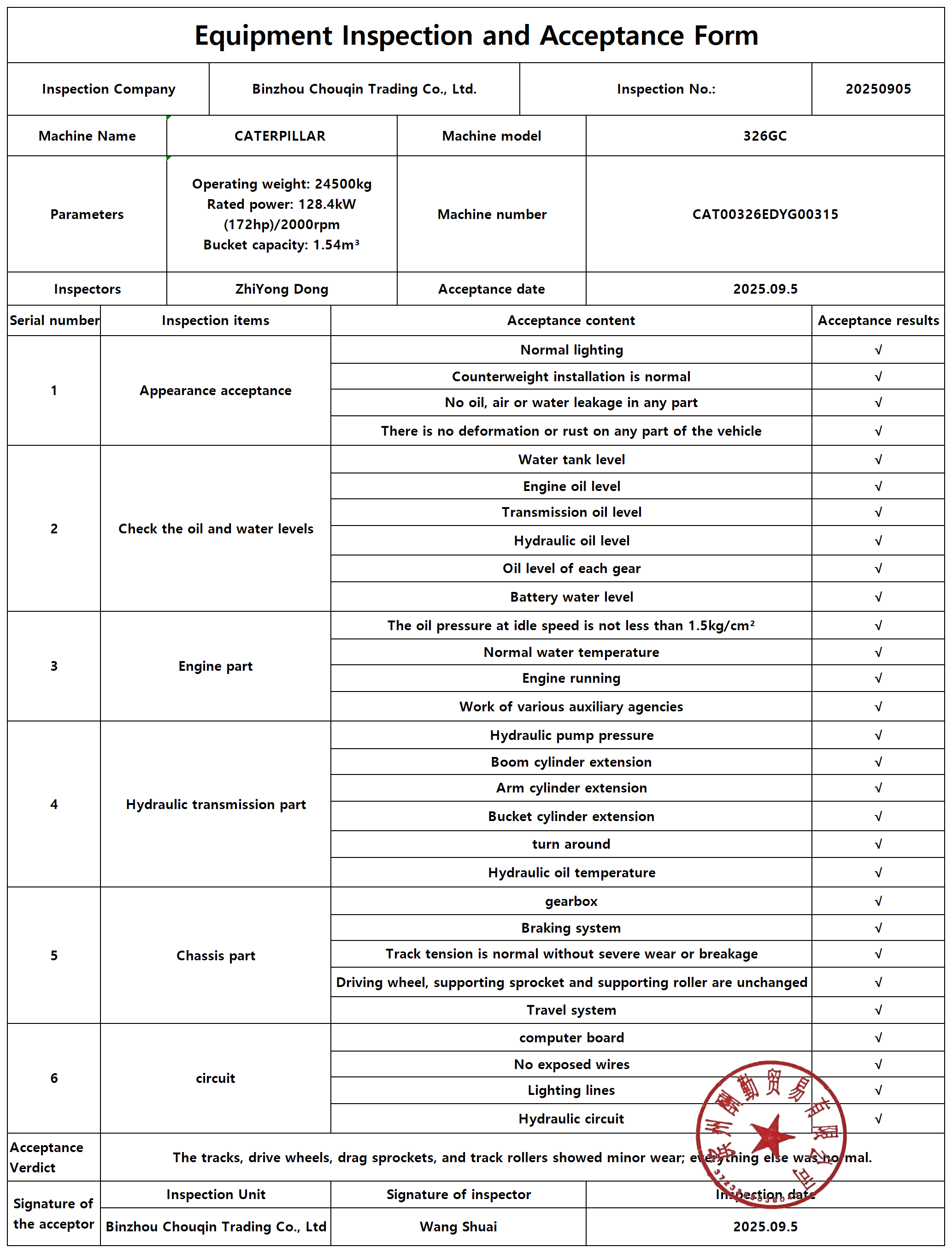 Equipment Inspection and Acceptance Form: