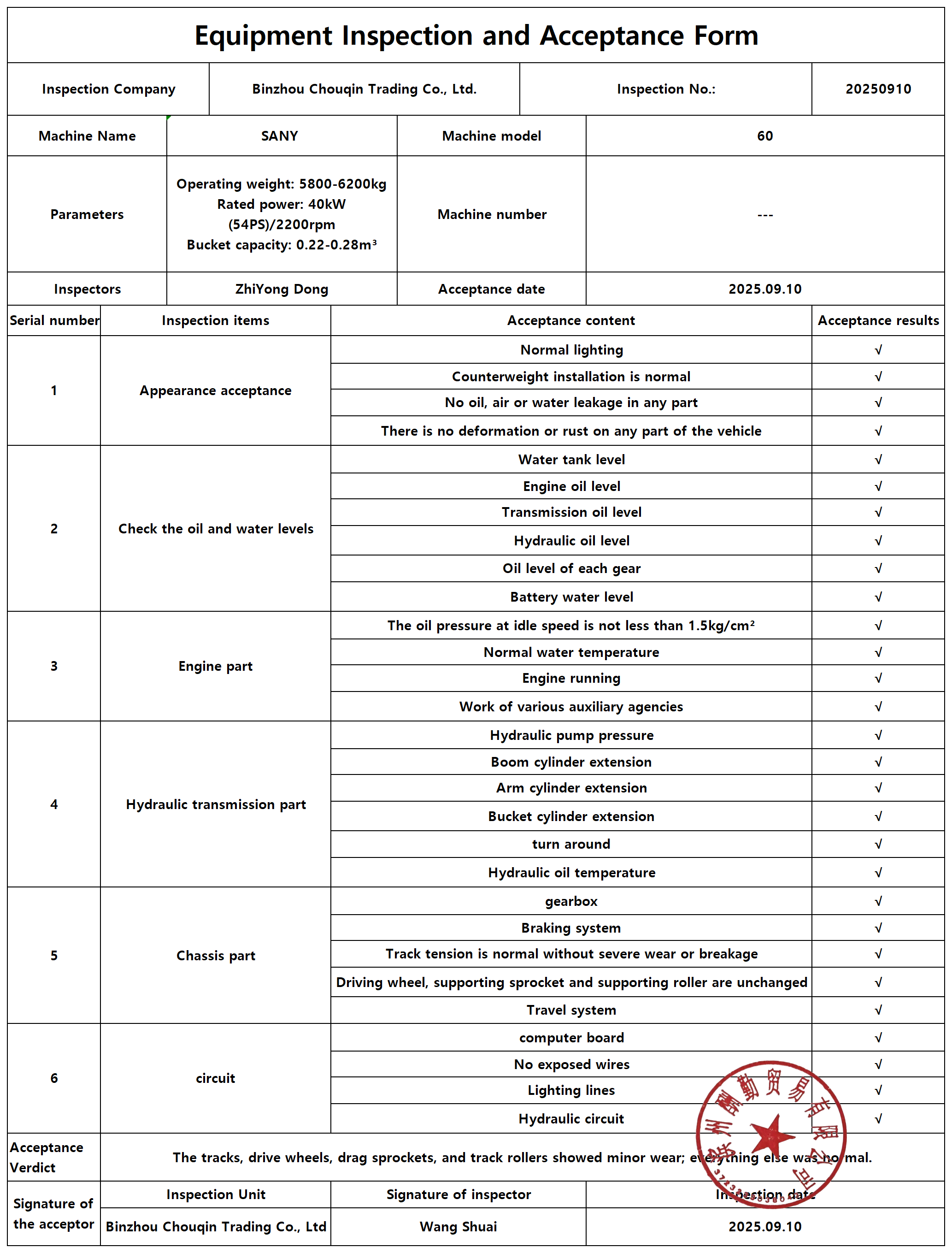 Equipment Inspection and Acceptance Form: